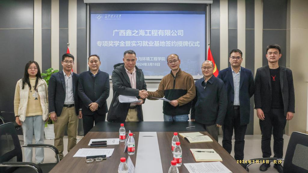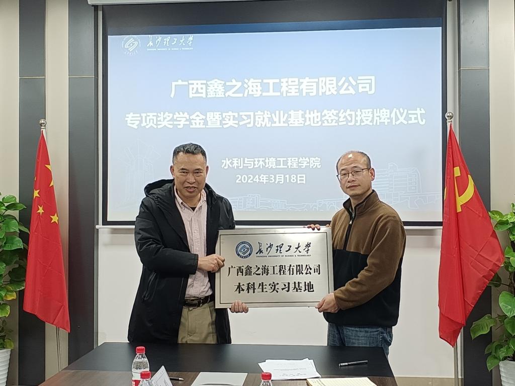 近日,水利学院举行“鑫之海”专项奖学金捐赠仪式暨实习就业基地签约授牌仪式。广西鑫之海工程有限公司总经理、91届港航专业校友唐高飞一行、水利学院副院长邓斌、盛丰出席仪式,辅导员及学生代表参加。仪式由水利学院副院长孙士权主持。