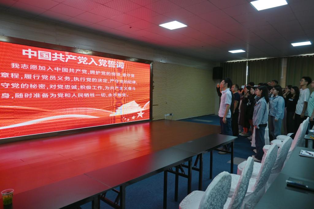 “我志愿加入中国共产党……随时准备为党和人民牺牲一切,永不叛党。”现场师生党员在张伟的带领下,面对鲜红的党旗,共同高举右拳,一起重温入党誓词。现场宣誓铿锵有力,表达了师生党员们对党的赤诚忠心和为共产主义奋斗终身的坚定决心。