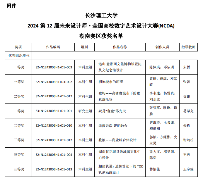 此外,在省级竞赛中,李韦逸、杨雪贞、刘永红同学在指导老师贺鹏的指导下,其作品《垂屿——高密度城市下的垂直游乐场》荣获二等奖;张强英、欧璐、谭腾同学在指导老师易学尧的指导下,作品《疑是“客盒”落九天》荣获二等奖;曾维涛、王希诺、鲍健翔同学在指导老师朱哲的指导下,作品《绿茵云端——智能融合》荣获二等奖。与此同时,郭桢、方耀彬、史立吴同学在指导老师谢劲松的指导下,作品《叠浪——商业综合体设计》荣获三等奖;梁力文、邓吴阳、陈奕同学在指导老师王蓉的指导下,作品《湖南省花垣县边城镇文化中心设计》荣获三等奖;林怡佳同学在指导老师王宇霖的指导下,作品《超级轨道:遗传算法下的 TOD 轨道系统设计》荣获三等奖。这些优异成绩的取得,充分彰显了建筑学院学子的创新精神和专业实力,展现了新时代青年的卓越风采,为学校赢得了荣誉。