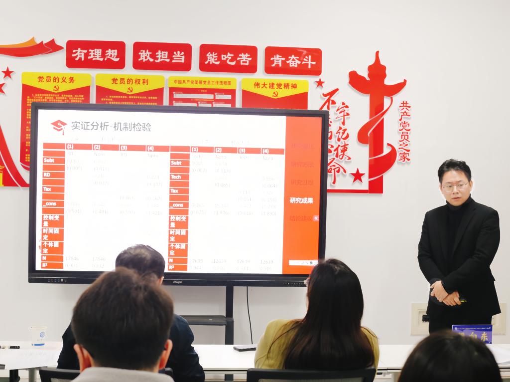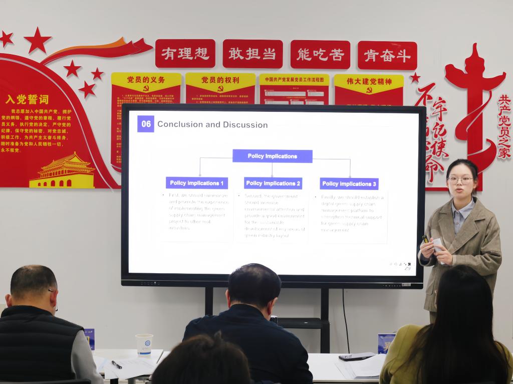 论坛收到了来自工商管理学、应用经济学、管理科学与工程、土木工程、马克思主义理论等全校多个学科的53位研究生代表就人工智能、区块链技术、气候经济、数智技术、绿色金融、双碳发展等多个主题进行研究。经评委评选,共有13篇论文在学术分论坛中进行现场答辩并角逐一二等奖。研究生蔡亚男作了题为《混合采购下预制菜供应链质量披露策略研究》的报告,她发现质量混合比率是影响预制菜企业决策的关键因素,在混合比率很低或很高时,区块链披露策略更优;研究生游涛红提到,排放交易系统(ETS)给资本市场带来了显著的波动风险,这些风险在很大程度上源于不断恶化的信息环境和投资者日益增长的悲观情绪,为此,她建议政府建立一个稳定的信息披露政策框架,并为正在进行低碳转型的企业提供实质性的政策支持;研究生刘琴阐述了建筑新质生产力的核心要素及其动力机制,从数智技术层面提出了六项旨在推动建筑业新质生产力升级的对策。