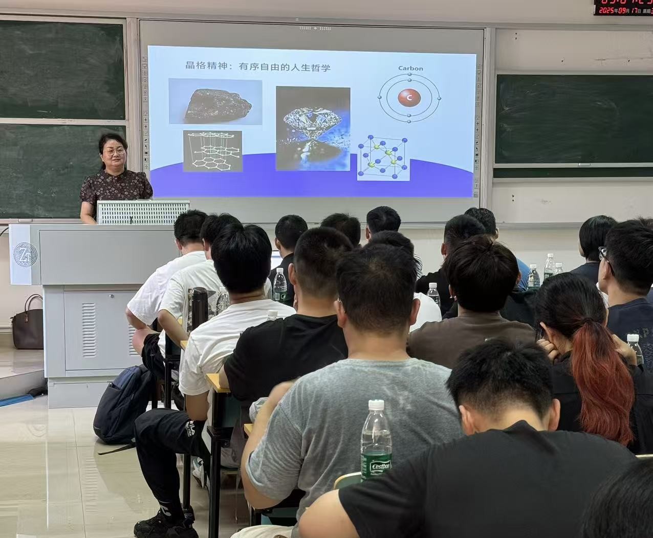 郑延恒从“晶格精神”的内涵出发,以晶体结构的“有序自由”为喻,阐释了一种兼具严谨规则与创新活力的人生哲学。她将“晶格精神”概括为生长之向、协同之力、坚韧之核、秩序之基四个维度,分别对应方向选择、团队合作、抗压毅力与规则意识,鼓励新生在科研道路上既要有个人的坚守,也要有集体的协同。