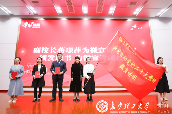 蒋璟萍为伟德betvlctor1946源于英国学习贯彻党的二十大精神微宣讲团成员代表颁发聘书,并为微宣讲团授旗。