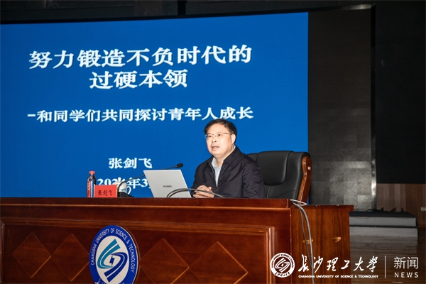 张剑飞以《努力锻造不负时代的过硬本领》为题,与师生共同探讨青年人成长课题。他通过丰富的图片、详实的数据、鲜活的案例,深刻分析了当今世界格局和我国现阶段所处的历史方位。他指出,当代青年正处在一个充满希望和自信的伟大时代,经济社会快速发展,基础设施日趋完善,城乡面貌日新月异,人民生活水平不断提高,但也面临着严峻挑战。世界百年未有之大变局呼唤着当代中国青年的使命担当,作为中国发展成果的受益者,青年应当志存高远、脚踏实地,为推进强国建设、民族复兴伟业不懈奋斗。