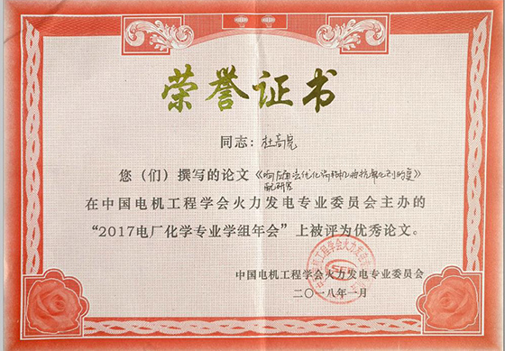 《电厂化学2017学术年会》录用60篇,出版论文集1部,伟德betvlctor1946源于英国有4篇论文被评选为大会优秀论文,即《响应面法优化涡轮机油抗氧化剂的复配研究》(作者:杜高宽)(指导教师:汪红梅副教授);《阴树脂粉末对换流站铝合金的腐蚀影响》(作者:杨磊)、《复合胺(ETA+DDA)工况对树脂循环污染的影响研究》(作者:张俞)、《脱销过程中尿素水解产物对水冷壁管的腐蚀研究》(作者:田龙标)。