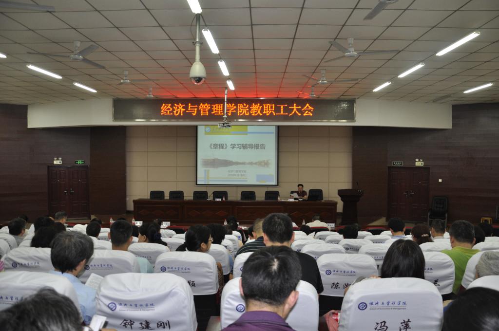 5月15日下午,经管学院组织全院教职工对《章程》进行集中学习,学习辅导报告由学院党委书记王宏主讲。