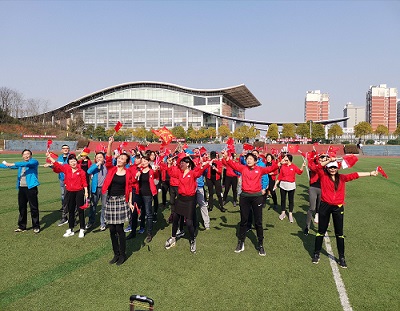 “我和我的祖国,一刻也不能分割......”,伴随着《我和我的祖国》歌曲旋律的响起,80名教职工挥舞着国旗从四面八方走入体育场齐声放歌。悠扬熟悉的旋律回荡在整个足球场。参加校工会庆“三八”教职工环校跑(健步行)活动的教职工也纷纷自发加入合唱。虽然只有短短几分钟的歌曲,但是这首耳熟能详的歌曲迅速将现场教职工的热情点燃,大家纷纷驻足欣赏。