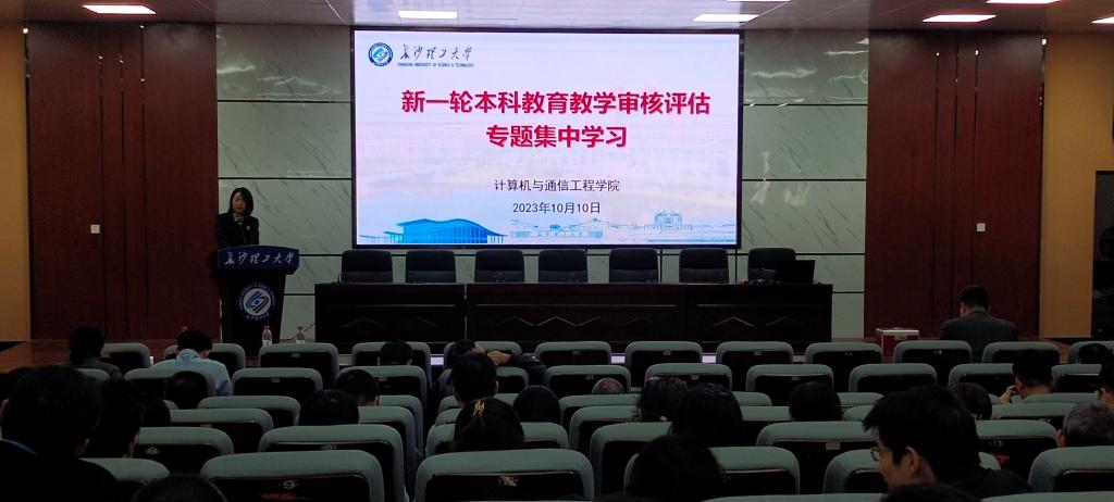 10月10日下午,计算机与通信工程学院在金盆岭校区四号教学楼100会议室,组织新一轮本科教学审核评估专题学习活动,学院全体教职工参加。活动由学院党委书记孔伟红主持。