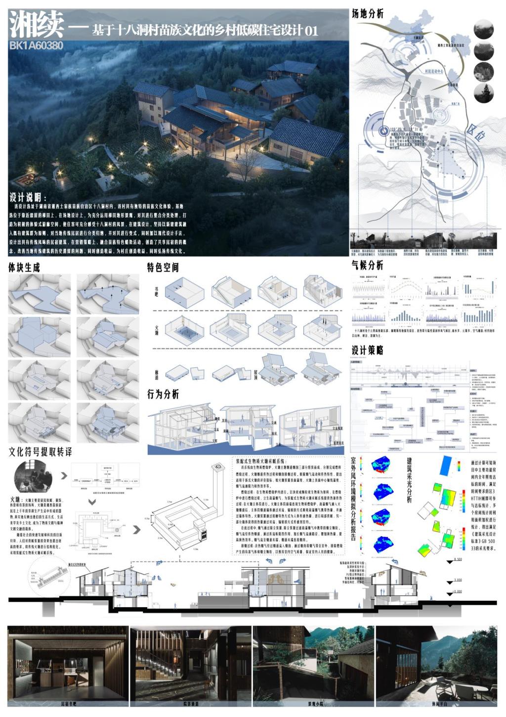 获奖项目“湘续-基于十八洞村苗族文化的乡村低碳住宅设计”选址于湖南省湘西土家族苗族自治州十八洞村,该村具有独特的苗族文化,在这样的情境场域里,充分感知梯田地形景观,对其集约分类,依托景观面营造体验式游廊空间,充分展现十八洞村的独特地域风情;在建筑设计上,坚持以融入传统建筑聚落肌理为原则,将新建建筑以分散式布局形式融入既有建筑群,对当地传统民居空间及构造类型进行归纳提炼,以游客的情境体验引领高质量的物理环境营造,通过空间、构造、材料多层次集成绿色建筑技术,将湘西人文与自然融入现代高质量绿色民宿设计;同时,在运营策略上依托苗族特有的蜡染传统民间工艺组织的体验活动,在展现苗家风情、增加用户粘性的同时,给当地居民脱贫创收增加有效渠道,让居民与游客在共享民宿这一新质生产力的引领下享受美好生活。项目伊始,团队就第一时间赴十八洞村及周边村寨实地调研:发掘苗族山寨的空间特性,重温承载的湘西文化记忆。在梳理整合调研与线上资料的基础上,解析十八洞村传统民居的优点与不足。设计坚持保护原有生态的理念,以微介入的方式优化空间组织,在绿建专业软件斯维尔的辅助下计算、优化、评估绿建技术对于节能与舒适的有效性,提升传统民居的品质。