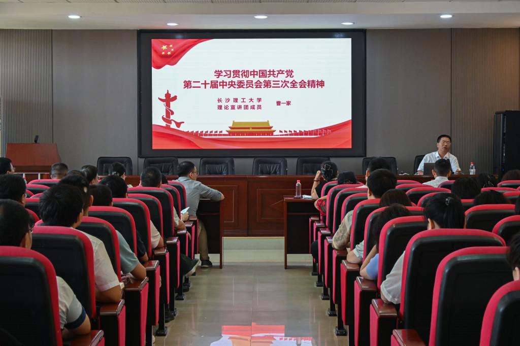 曹一家从深刻认识和把握这次全会精神,深入学习领会习近平总书记在党的二十届三中全会上的重要讲话精神,党的二十届三中全会对教育、科技、人才提出了新要求、新任务,进一步全面深化改革是建设高等教育强省的必由之路,进一步全面深化改革、奋力书就高等教育高质量发展的“长理新篇章”等五个方面,对党的二十届三中全会精神进行了深入系统解读和宣讲。