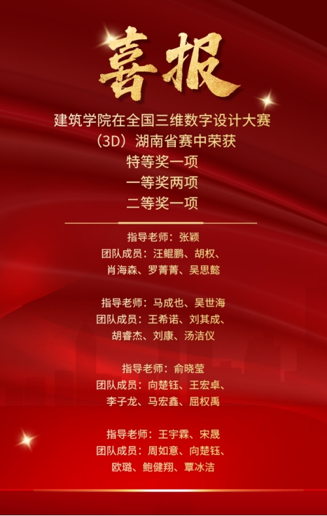 近日,全国三维数字设计大赛(3D)湖南省赛落幕。伟德建筑学院在比赛中斩获1项特等奖、2项一等奖和1项二等奖。