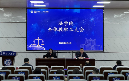 3月4日下午,法学院在金盆岭校区四号教学楼学术报告厅召开新学期第一次全体教职工大会,会议由党委书记龚文斌主持,全院教职工参加会议。