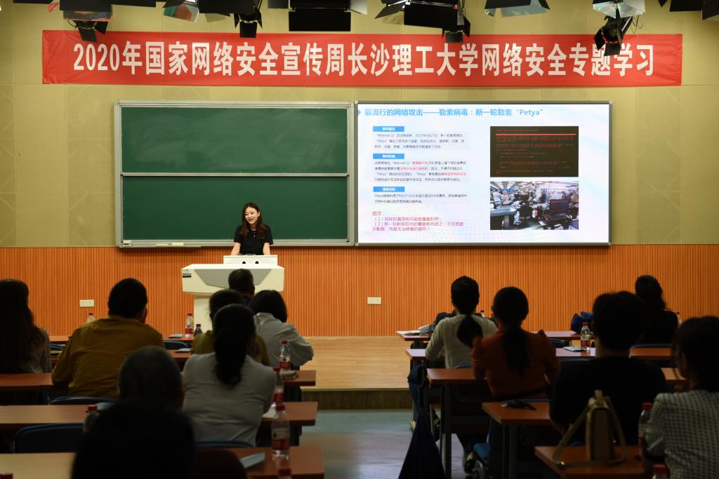 活动第二阶段是校园网络安全知识讲座。讲座由我省安全专业企业湖南盈聚信息技术有限公司专职培训师王雅琼主讲。讲座以网络安全意识培养为主题,结合贴近师生学习生活的典型案例,从上网安全、办公安全、谨防诈骗三个方面进行了详细讲解,最后用通俗易懂、生动幽默的总结语言对安全上网、安全办公、谨防诈骗提出了建议。讲座前后,信息化中心给各单位参会人员发放了网络安全宣传小册子。