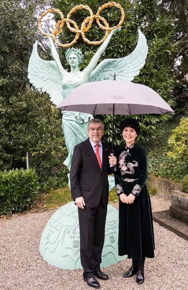 黄剑与国际奥委会主席托马斯·巴赫在瑞士洛桑国际奥林匹克博物馆前《奥运女神》雕塑前。