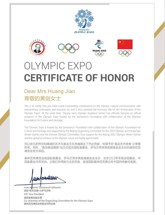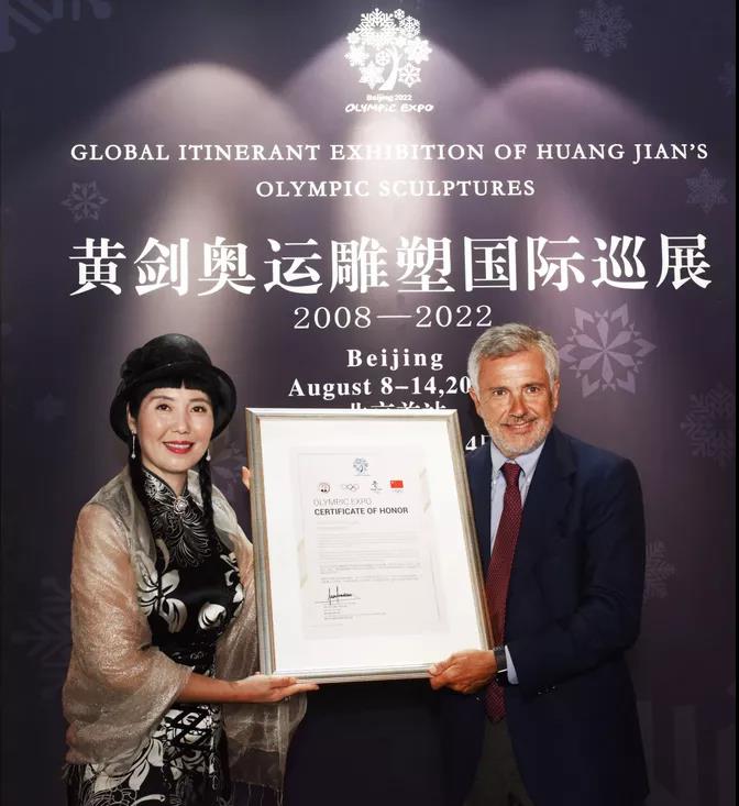 国际奥委会副主席、北京2022年冬奥会协调委员会主席萨马兰奇(右)授予伟德80级校友、中国雕塑艺术家黄剑(左)“奥运艺术使者"荣誉称号