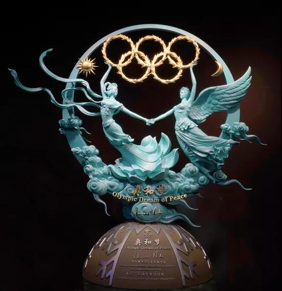 黄剑作品《同心圆梦》。奥运女神携手嫦娥月神奔向太空祝福奥运。东京奥运会之际,巴赫主席为该作品签字并委托国际奥委会发来感谢函:“衷心感谢黄剑女士对奥林匹克运动和艺术的支持与贡献。”