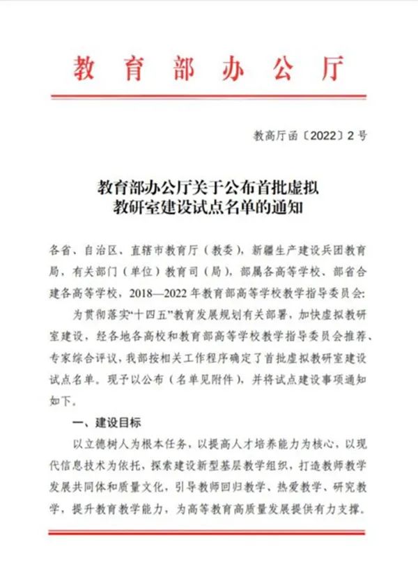 此次评选活动经高校自主申报、教育部高等学校教学指导委员会和省级教育行政管理部门推荐、专家综合评议,教育部确定首批虚拟教研室建设试点名单。其建设目标以立德树人为根本任务,以提高人才培养能力为核心,以现代信息技术为依托,探索建设新型基层教学组织,打造教师教学发展共同体和质量文化,引导教师回归教学、热爱教学、研究教学,提升教育教学能力,为高等教育高质量发展提供有力支撑。