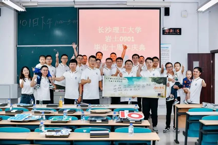 岩土0901班毕业十周年庆典合影留念,昔日同学共赴10年之约,校园里处处是他们满满的回忆,回到母校,一秒穿越回那个热情似火的年岁。