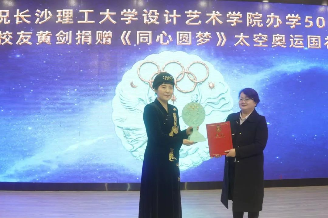 “奥运艺术大使”黄剑校友向学校捐赠了“同心圆梦”雕塑作品。