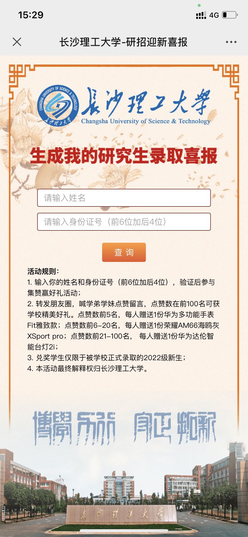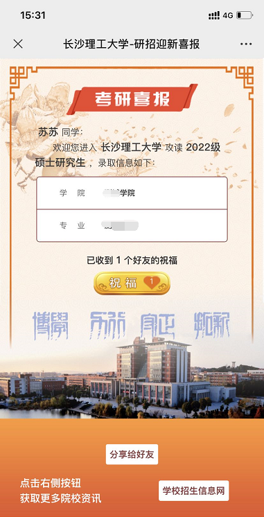 扫描下方二维码,生成你的专属喜报,将喜报转发至朋友圈邀好友集赞,在2022年8月28日前集点赞数,点赞数排名前100名的,学校将为你准备精美礼品一份!