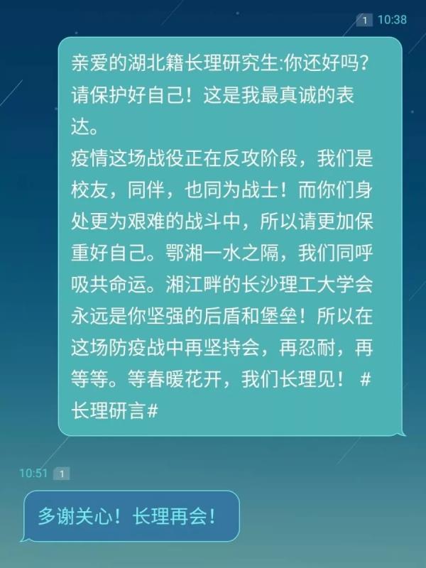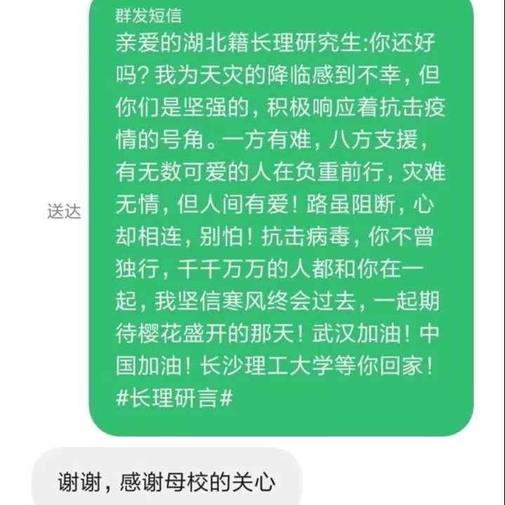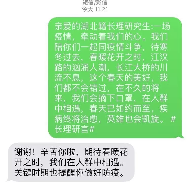 “谢谢,待春暖花开,欢迎来湖北,赏樱花,吃热干面,逛荆州古城,游三峡人家。”伟德betvlctor1946源于英国湖北籍研究生姚同学回复了一条特殊的短信,而他收到的这条短信是不知名的研究生同学发来的祝福。与此同时,长理247名湖北籍研究生也都在近期收了这样特别慰问短信。