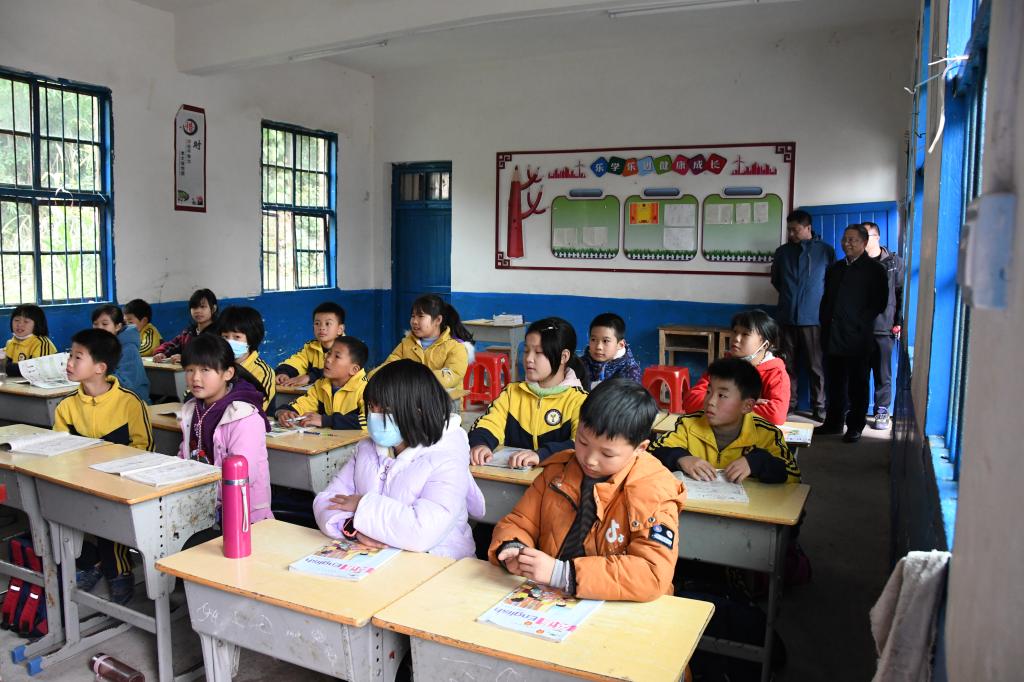 刚到驻点村,胡永乐一行首先走访看望了在马头桥镇中心学校支教的研究生志愿支教队成员,详细询问了他们生活工作情况并为4位队员送去了生活物资。随后,胡永乐一行又赶往坪山小学,在小学里他先后旁听了5位支教队员的授课情况,语文课堂书声朗朗,班级活动开展得有声有色;数学课堂上孩子们聚精会神地与老师进行乘法口诀的互动;英语课堂上老师正在与孩子进行“我说五官你来指”的游戏,孩子们个个精神昂扬,欢快活泼。