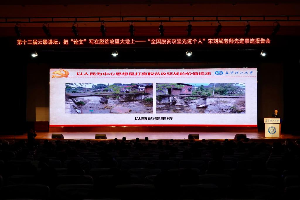 五教大礼堂内座无虚席,在场研究生们专注倾听宋刘斌老师声情并茂的演讲,仿佛已置身于枧杆山村的蜕变历程之中。报告中,宋老师首先分享在北京人民大会堂出席全国脱贫攻坚总结表彰大会,亲耳聆听习近平总书记报告的真实感受。随后他结合学校扶贫工作队构建的“党建+文化+产业”的“扶智扶贫”模式,讲述了他在扶贫工作期间的许多真实故事,从成立党员志愿服务队、修建贵王桥和5组通护路,到投入资金建设易地扶贫搬迁安置点、动员全校师生“带货”帮售农产品。通过三年来的不懈努力,在学校党委的正确领导和亲切关怀下,宋老师及其扶贫团队带领枧杆山村村民摆脱了贫穷落后的面貌,456名贫困人口全部脱贫,昔日的省级深度贫困村,迎来了幸福生活。