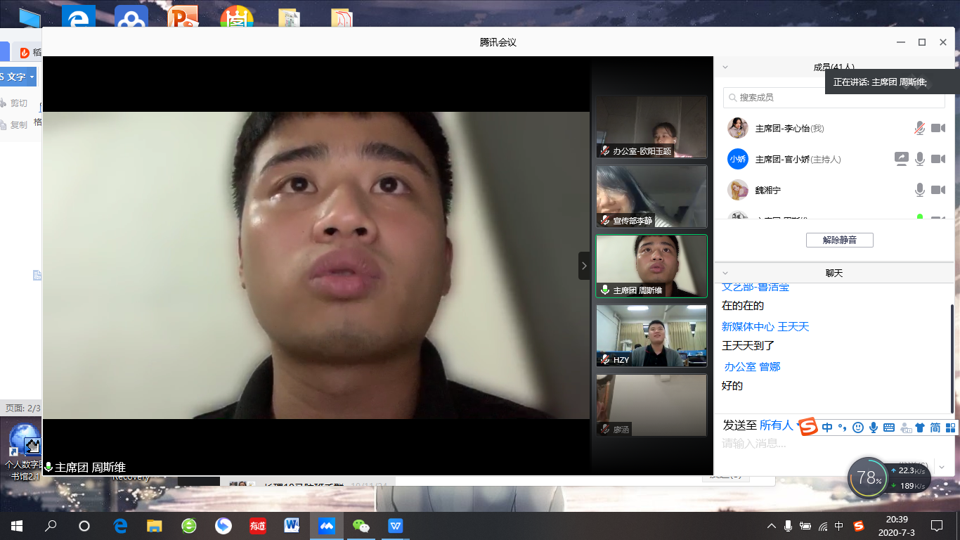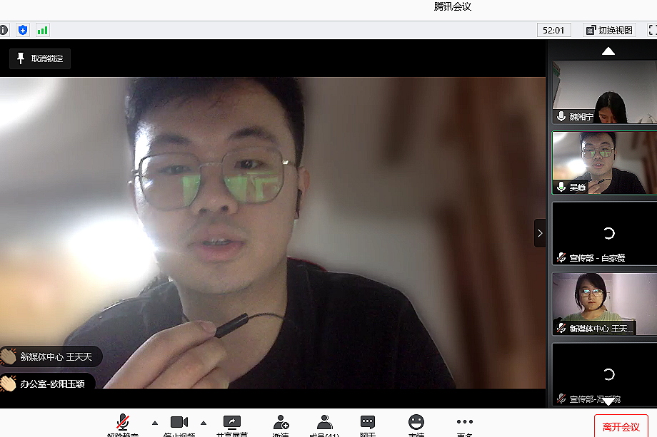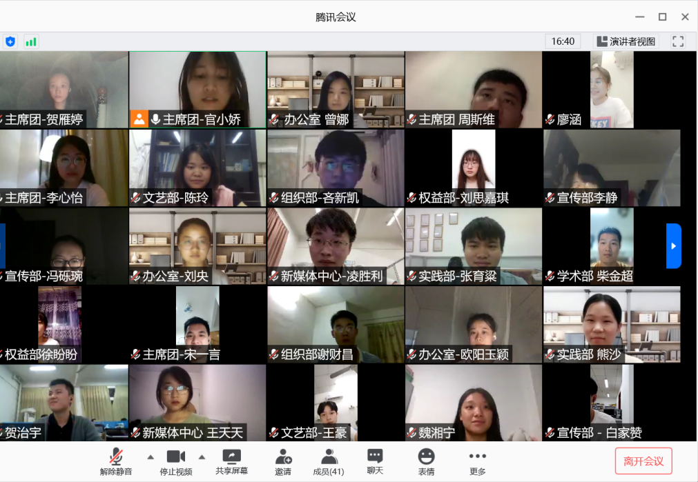 新任干部一一进行了自我介绍,新任执行主席周斯维作为代表发言,他感谢学长学姐在过去一年的辛勤付出,并代表全体新任干部表态:在研工部领导和老师的指导下,在广大同学们的支持下,努力打造一支“不怕苦、敢担当、有情怀”的研究生干部队伍,团结协作、奋发有为,争取更加优异的成绩。