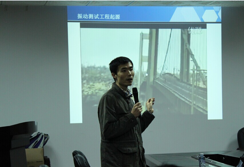 张家滨老师硕士、博士及博士后阶段专攻结构动力学研究,并在德国企业进行过结构动力学测试软件开发与维护,积累了各种大型工程结构的复杂动力学性能的丰富经验。讲座主要介绍了动力测试与信号分析两部分内容。他首先从塔科马海峡大桥坍塌实例入手,介绍了结构振动的各种不利影响,包括对人体的不良影响、影响机械加工精度等;紧接着,他介绍了振动测试的目的,包括发现共振隐患、降低噪声污染和提高人体舒适性。随后,他通过简单易懂的图例,为大家简要介绍了振动信号的特点及主要的研究方法。