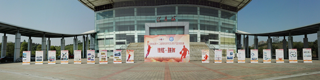 云塘校区的体育馆外整齐摆放着湖南省第十二届高校研究生男子篮球联赛16支参赛队伍的宣传展板