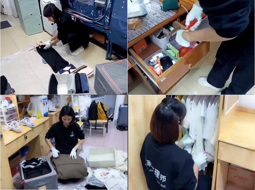 收纳师对男寝宿舍桌柜和女寝宿舍立柜进行了实景操作,给大家展现了收纳技巧的应用,现场同学反响十分热烈,主动跟收纳师交流自己的想法,同时几十余名同学通过腾讯会议观看了整场直播教学活动,大家纷纷表示收获颇丰。