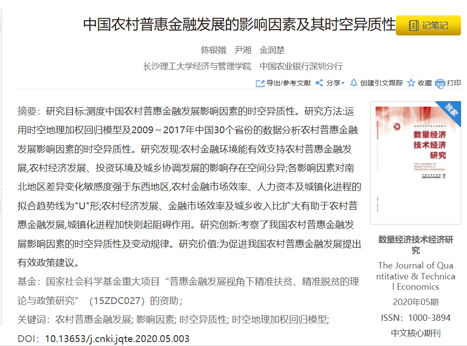 2020年5月,伟德经管学院2018级应用经济学硕士研究生尹湘(第二作者)与导师陈银娥(第一作者)合作的论文《中国农村普惠金融发展的影响因素及其时空异质性》在权威期刊《数量经济技术经济研究》(2020年第5期)发表,是该院提高研究生培养质量的重要成果之一。