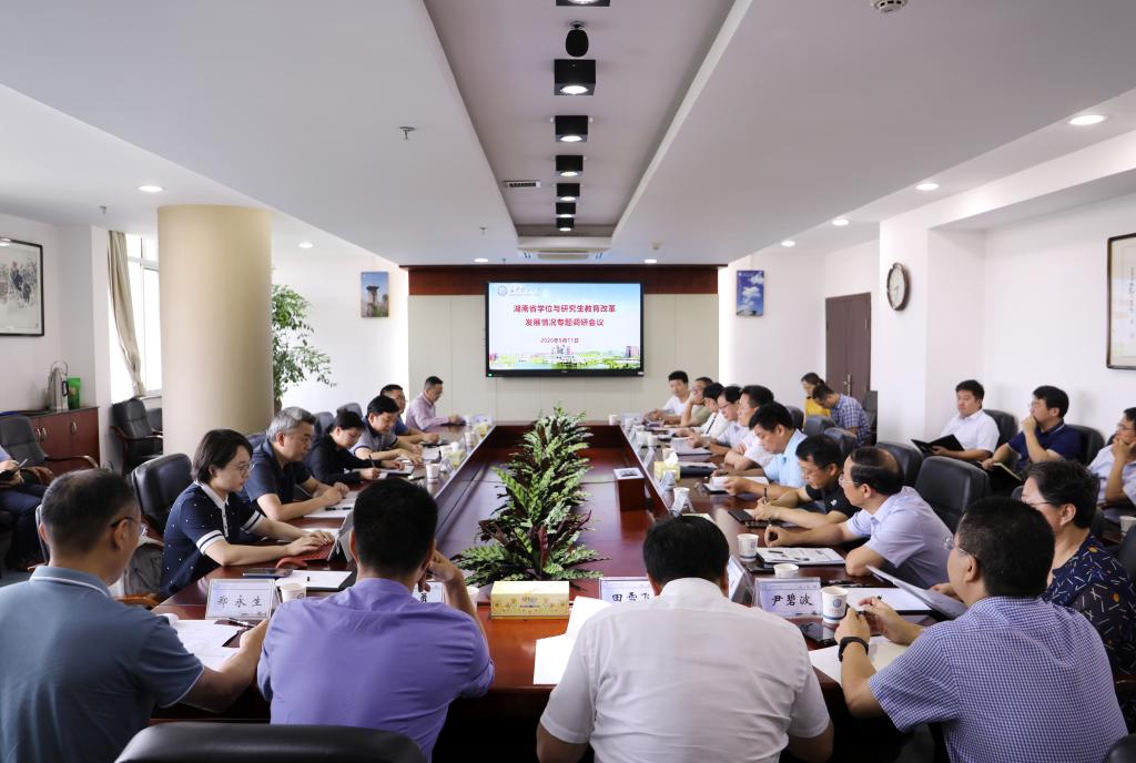 此次调研分两阶段进行,首先调研组在五楼会议室就“十三五”学位与研究生教育改革发展成就;建立健全研究生教育立德树人工作制度机制情况;主动对接国家和我省重大战略需求,服务引领经济社会发展情况;导师队伍建设情况:包括导师的权益,导师的遴选、培训、管理、服务和考核等;人才培养体系建设情况:包括课程设置、科教融合和产教融合、实践能力和创新能力培养、国际交流合作等;考试招生制度情况:包括生源质量优化、分类招生制度改革等;质量保障体系建设情况:包括政策、人员、经费投入等7个方面听取了伟德副校长叶泽、湖南中医药大学副校长彭清华、湖南工商大学副校长曾伏秋介绍本单位学位与研究生教育整体情况汇报。与会单位的研究生院院长、财务、学科、规划等相关职能部门负责人、学校部分培养学院院长进行了交流与发言。