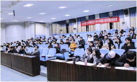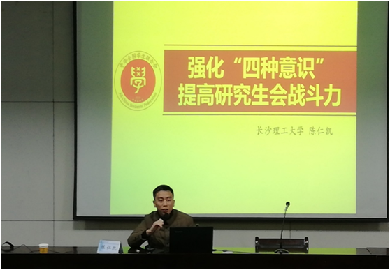 陈仁凯以“战斗力=个人素质*(个人执行力+机制保障力)*有效信息流速”这一公式开篇,紧紧围绕研究生会干部的个人执行力、机制保障力和有效信息流速三个影响因素进行了详细讲述。他结合从大学创业协会起家的企业家钱俊东、湘潭大学的三翼校园门户网站、九段秘书、试衣间等14个案例,激励大家培养发现问题、分析问题、解决问题的思维方法,并着重强调研究生会干部要强化四大意识:一是职业意识,克服迷茫、敷衍等消极情绪,破除思维惰性,解决“愿意做”的问题;二是结果意识,克服形式主义和文牍主义,破除思想僵化,解决“做什么”的问题;三是学习意识,克服闭门造车和经验主义,克服思想浅薄,解决“怎么做”的问题;四是媒体意识,规避信息漏斗,增强媒体宣传的广泛性、实效性、准确性和精准度。