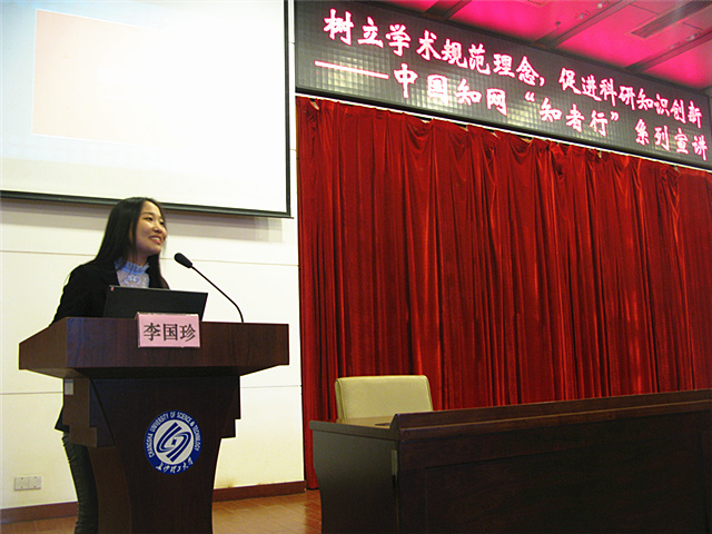 2月25日下午,中国知网“知者行”高校系列宣讲活动在伟德图书馆大报告厅举行。中国知网(CNKI)学位论文合作部编辑李国珍带来了题为“树立学术规范理念促进科研知识创新”的讲座。校党委委员、人文社科处处长杨鑫铨,研究生院院长管德清、副院长蒋菲,研究生导师代表、研究生教育管理工作人员和博、硕士研究生共300余人聆听了讲座。