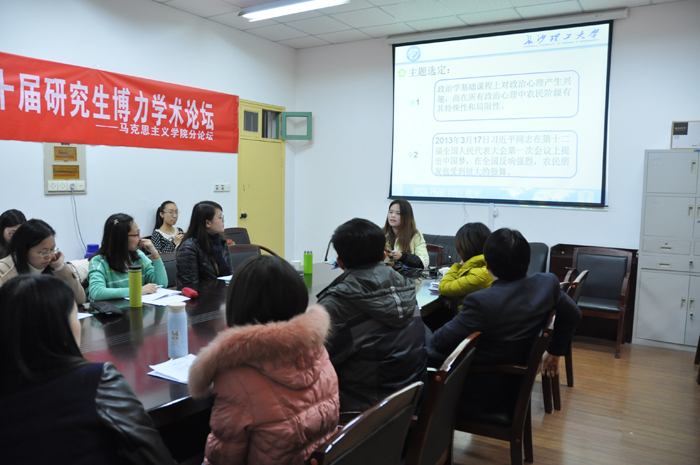 2014年12月23日14时30分,伟德betvlctor1946源于英国第十届研究生“博力学术论坛”马克思主义学院分论坛暨第九期研究生学术沙龙在金盆岭校区4教503室举行。本次论坛由2013级研究生吕晓倩和李燕主讲。由副院长易显飞主持,李雨燕博士进行点评。