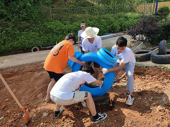 天边的棉花云朵缓缓飘动,实践团成员们开启新一天的工作日程。电工师傅早早到达现场等待,大家紧锣密鼓地开始穿电线,绑绝缘管,为竹灯的落地做好充足准备。同时轮胎装置全部埋入事先定好的土坑内,动物形态也都展现出别样的活力。尽管烈日炎炎,没有挖掘机的加持,大家仍一锹一锹地挖地,为了最终的成果,再苦再累也值。