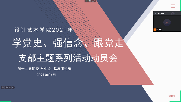 为引导艺术学子在专业课程、志愿服务等实践过程中,继承和发扬五四精神,设计艺术学院发挥专业特色,开展形式多样的“百年风华,青春扬帆”五四主题团日活动。学院联合社区组织开展 “童心向党,献礼百年”志愿服务活动,邀请优秀毕业生团员王廉政学长分享学习经验。各年级团支部积极参与,例如数媒2003开展“百年风华,青春扬帆”红色文旅活动,同时支部团员结合自身专业特色制作红色海报;数媒1903开展“百年风华,青春扬帆”五四精神宣讲会;产品1802开展线上“百年风华,青春扬帆”主题班会等等,活动形式多样,颇有成效。