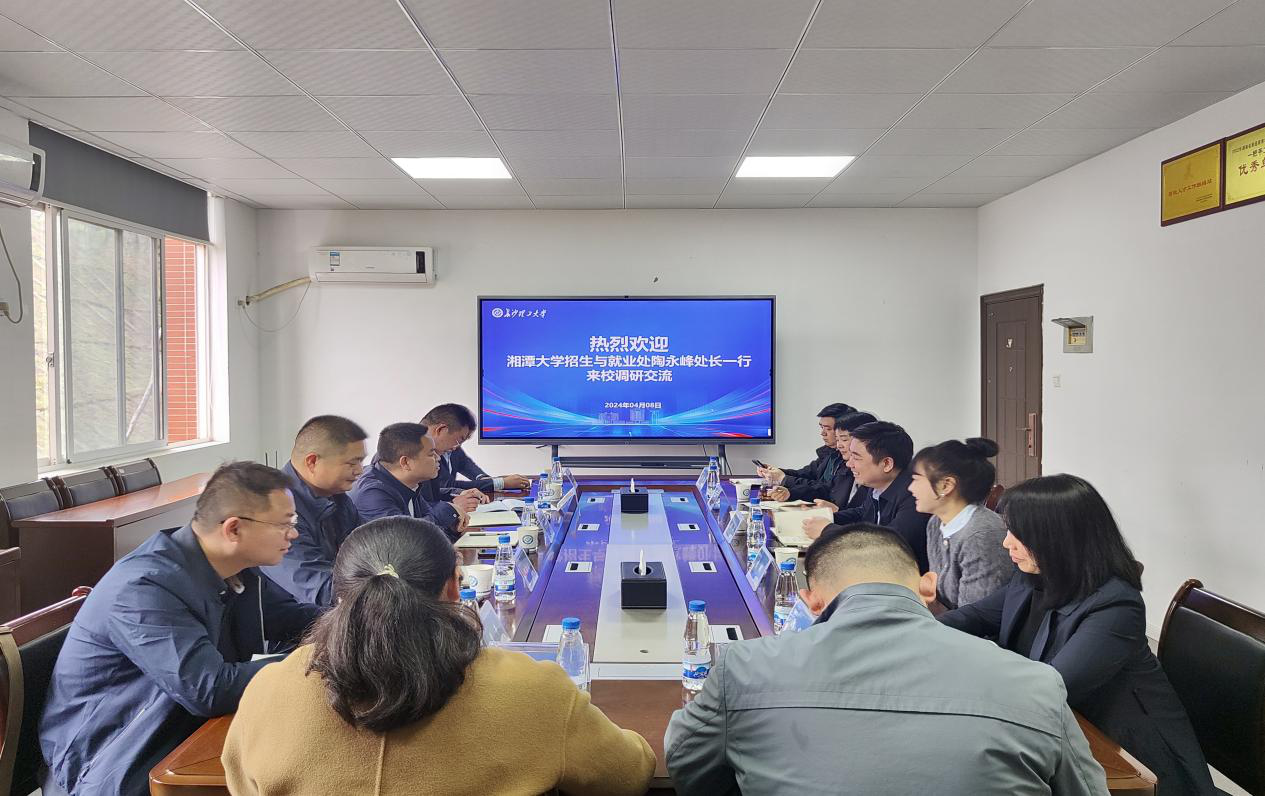 4月8日下午,湘潭大学招生与就业指导处处长陶永峰一行7人来校调研交流,伟德招生就业处处长田上、副处长李娜及各科室负责人参加。